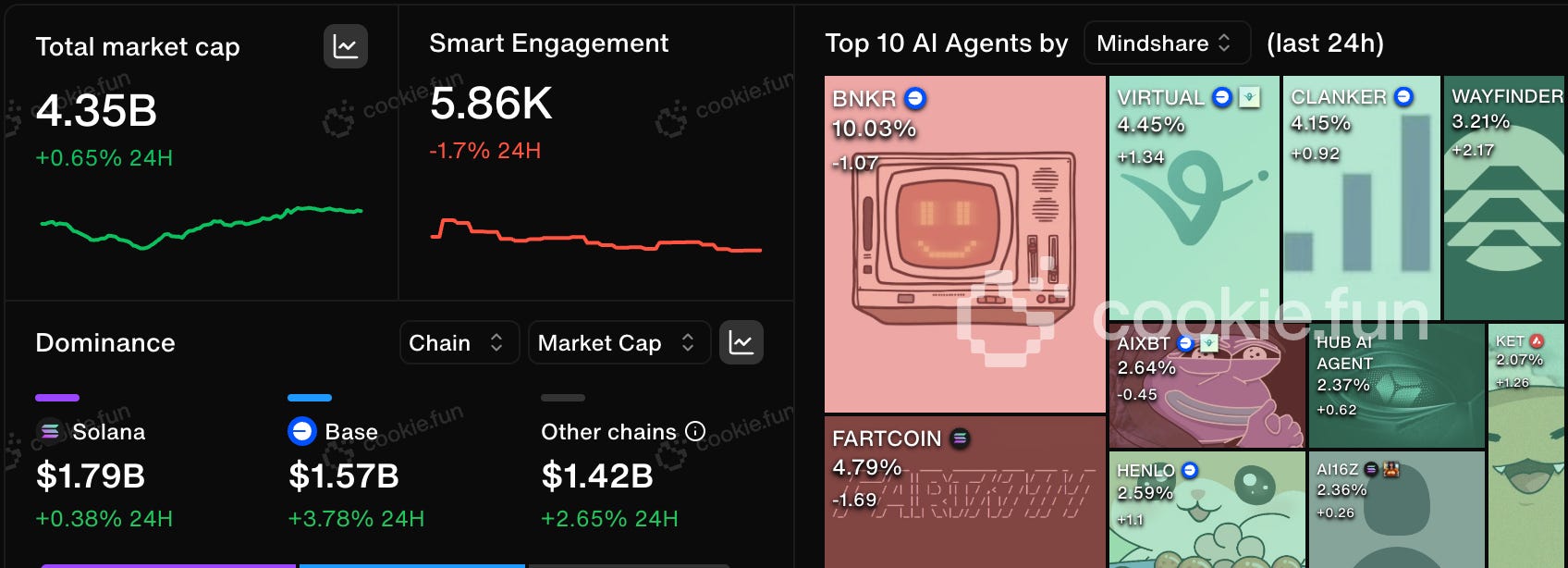 $VIRTUAL ($416M): A framework and infrastructure designed to create, deploy, and monetize autonomous AI agents across various platforms and applications, such as gaming, entertainment, social interactions, and more.